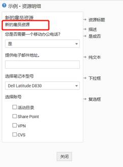 向服務請求模板添加“資源”,以縮小用戶的需求范圍,避免不必要的電子郵件來回。“資源”是一組問題,可幫助技術人員了解服務請求者的確切需求。以下是服務請求的示例資源部分,