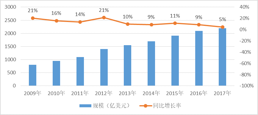 在全球信息化浪潮的強勁推動下,軟件產業已發展成為全球規模最大、最具活力的產業。 2009年,全球軟件外包規模為800億美元,到2017年,全球軟件外包規模達到2200億美元。全球軟件外包產業高速增長后,目前增速有所放緩,增速仍接近10%。